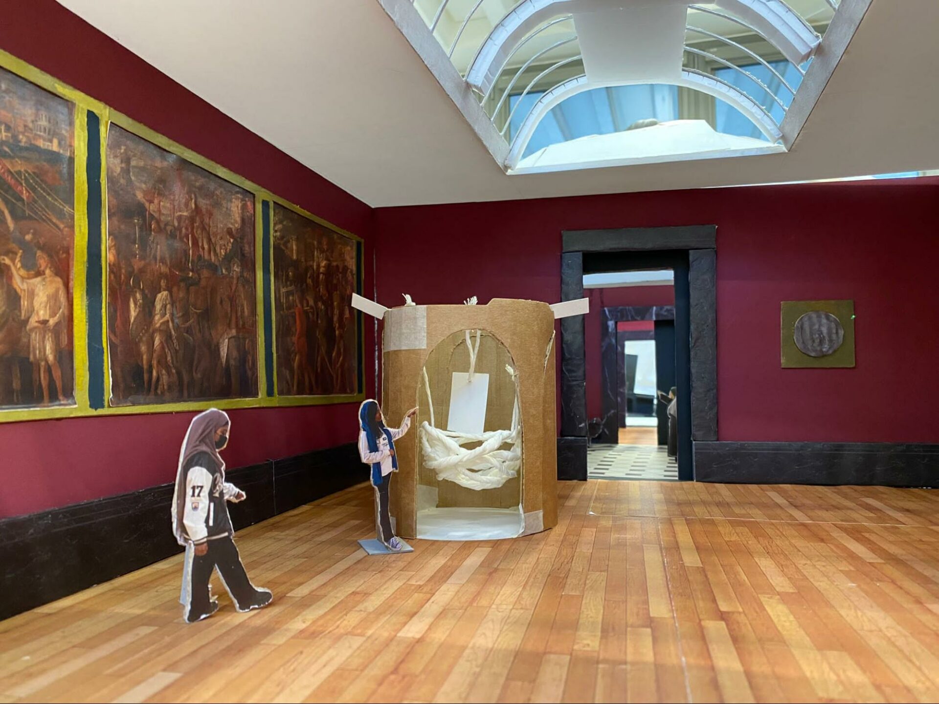 There was plenty of variety in the work presented, and the photos here show some of what we saw. Of particular interest was the large scale model of the site – a suite of paintings galleries within the National Gallery – which was used to show each student’s proposal in the context of the existing space. Photos of the students’ own scaled model installations within the gallery are particularly effective, in some instances they seem so realistic that it’s hard to see that it is a model rather than a real space. If you look closely at one, you can see a giant peering into the space from the doorway in the distance.